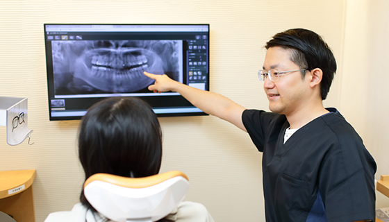 レントゲンや口腔内カメラ、模型や説明ツールを用いて患者さん目線の説明を行います。