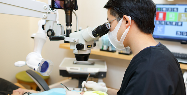 治療において拡大鏡や歯科用顕微鏡であるマイクロスコープを使用した精密な治療を行っています。肉眼では捉えられなかった細かい患部まで拡大して確認できることにより精密な治療を行うことができます。